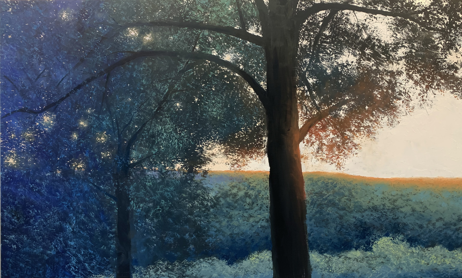 ZWEI BÄUME IM SOMMER, Öl auf Leinwand, 120x200cm, 2023